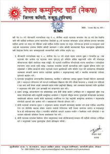 सोती घटना : दोषिलाई कावाही गर्न नेकपा रुकुम पश्चिम द्धारा सरकार सँग माग