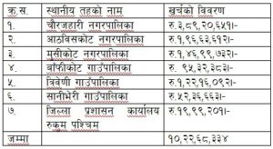 प्रमुख जिल्ला अधिकारी उपेन्द्रराज पौड्यालले जिल्ला प्रशासन कार्यालयबाट खर्च गरिएको रकमबाट सबै पालिकामा स्वास्थ्य सामग्री उपलब्ध गराइएको बताएका छन् । त्यस्तै सुरक्षाकर्मी र कर्मचारीको लागि पनि आवश्यक स्वास्थ्य सामग्री खरिद गरिएको प्रजिअ पौड्यालले जनाए । रुकुम पश्चिमका ६ वटा स्थानीय तहमध्ये सबैभन्दा वढी चौरजहारी नगरपालिकाले खर्च गरेको छ । तर रुकुममा स्थानीय तहहरुले शिक्षा क्षेत्रमा भने कुनै लगानी गरेका छैनन् ।