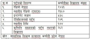 रुकुम पश्चिममा सूचनाको प्रभावकारी माध्यम सामुदायिक रेडियो नै हो । रुकुम पश्चिमका ६ वटा स्थानीय तहका ३० हजार ६४७ घरधुरी मध्ये झण्डै १८ हजार ३२९ घरमा रेडियोको पहुँच पुगेको जिल्ला तथ्याङ्क कार्यालयका तथ्याङ्क अधिकृत मेघराज पौडेलले जानकारी दिएका छन् । उनका अनुसार नेपालको जनगणना २०६८ का अनुसार रुकुम पश्चिममा सूचना सञ्चारको प्रभावकारी माध्यम रेडियो भएको तथ्याङ्कले देखाएको छ । भने टेलिभिजन प्रयोग कर्ता कुल घरधुरीको ३ दशमलव ७ प्रतिसतको पहुँचमा मात्र रहेको छ । त्यस्तै रुकुम पश्चिमका ३३ वडा मध्ये इन्टरनेटको पहँच ३५० घरधुरीमा मात्र रहेको पाईएको छ । यो तथ्याङ्कले पनि सूचना प्रभाहको मुख्य माध्यम रेडियो रहेको जिल्ला तथ्याङ्क कार्यालयले जनाएको छ । उता कर्णाली प्रदेश सरककारले १० जिल्लामा रहेका २ हजार ९४२ विद्यालयहरुमा गरेको सर्बेक्षणमा सबैभन्दा वढी रेडियो कै पहुँच देखिएको छ । भने सबैभन्दा कम टेलिभिजनको पुगेका विद्यालय रहेका छन् । भने २६२ विद्यालय कुनैपनि माध्यमको पहुँच पुग्न नसकेको कर्णाली प्रदेश सामाजिक विकास मन्त्री दल रावलले जनाए ।