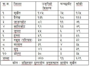 त्यस्तै जाजरकोट जिल्लाका ८२ वटा, कालिकोट जिल्लाका ९२ वटा, दैलेख जिल्लाका १३१ र सुर्खेत जिल्लाका १४५ रहेको अख्तियार दुरुपयोग अनुसन्धान आयोग सुर्खेतको तथ्याङ्कले देखाएको छ । चालू आर्थिक वर्षको तीन महिनामा जम्मा ९१ उजुरी फच्छ्र्यौट भएको छन् । जसमा सबैभन्दा वढी सुर्खेत जिल्लाका २५ वटा रहेका छन् । त्यस्तै दैलेख जिल्लाका ३७ वटा, जाजरकोटका १९, कालिकोटका ११ वटा, हुम्लाका ४ वटा, जुम्ला जिल्लाका १२ र रुकुम पश्चिमका १८ उजुरी फच्छ्र्यौट भएका छन् । त्यस्तै कालिकोट जिल्लाका १३, जाजरकोटका ११ वटा, जुम्लाका ६ वटा, रुकुम पश्चिमका ५ वटा र सल्यान जिल्लाका ४ वटा उजुरी फच्छ्र्यौट भएका छन् । त्यस्तै डोल्पा, मुगु र हुम्ला जिल्लाका ३÷३ वटा उजुरी फच्छ्र्याट भएका छन् ।